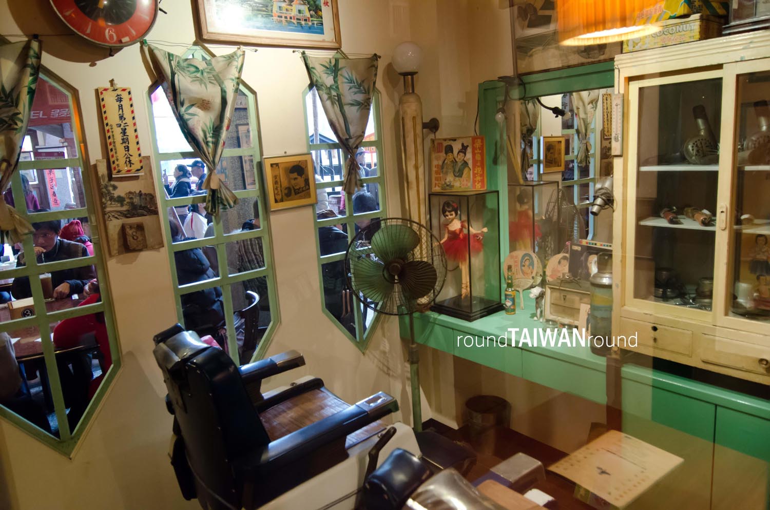 Although there are many excellent cafes and themed restaurants in Taichung, none quite compare to Banana New Paradise (香蕉新樂園). It's one of the most remarkable teahouses in Taichung, bringing to life a recreated street from 1920 to 1940 Taiwan, complete with Qing dynasty and colonial-era storefronts, original antiques, and collectible items. The street features a 50-year-old taxi, a camera store, a dentist's office, a barber shop, a candy store, and a movie theater. The walls are adorned with old posters documenting past concerns, such as contraception, electrical safety, and anti-communist sentiments.