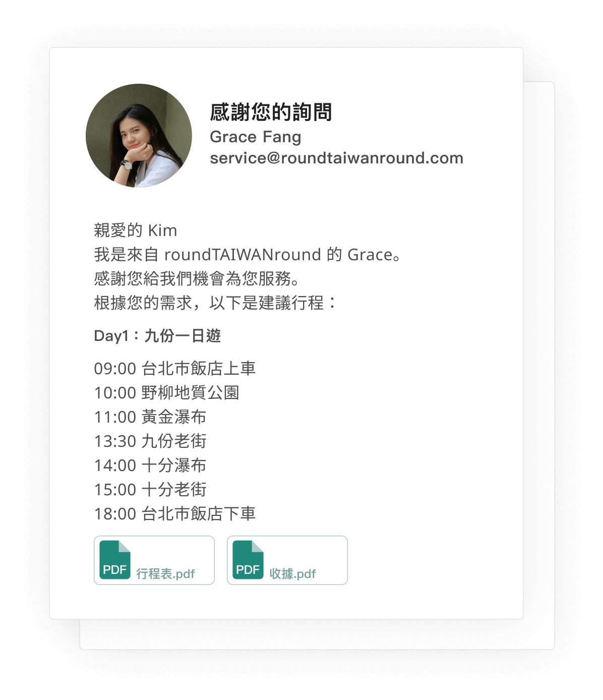 這包括接送地點、景點安排、住宿地點。我們還會推薦一些有趣的活動。